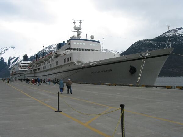 Universe Explorer moored in Skagway. It has a 15,000 volume library, the world's largest library-at-sea.